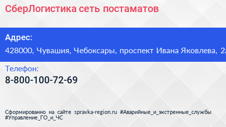 СберЛогистика, сеть постаматов по адресу 428000, Чувашия, Чебоксары, проспект Ивана Яковлева, 2а в дальнейшем Организация, размещена в следующих категориях: