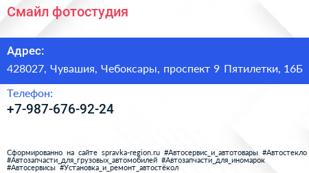 Смайл, фотостудия по адресу 428027, Чувашия, Чебоксары, проспект 9 Пятилетки, 16Б в дальнейшем Организация, размещена в следующих категориях: