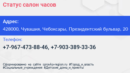 Статус, салон часов по адресу 428000, Чувашия, Чебоксары, Президентский бульвар, 20 в дальнейшем Организация, размещена в следующих категориях: