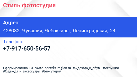 Стиль, фотостудия по адресу 428032, Чувашия, Чебоксары, Ленинградская, 24 в дальнейшем Организация, размещена в следующих категориях: