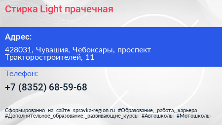 Стирка Light, прачечная по адресу 428031, Чувашия, Чебоксары, проспект Тракторостроителей, 11 в дальнейшем Организация, размещена в следующих категориях: