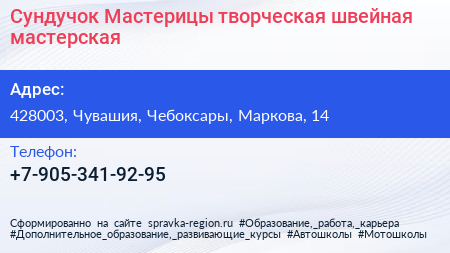 Сундучок Мастерицы, творческая швейная мастерская по адресу 428003, Чувашия, Чебоксары, Маркова, 14 в дальнейшем Организация, размещена в следующих категориях: