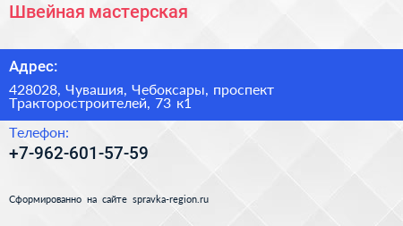 Швейная мастерская по адресу 428028, Чувашия, Чебоксары, проспект Тракторостроителей, 73 к1 в дальнейшем Организация, размещена в следующих категориях: