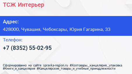 ТСЖ Интерьер по адресу 428000, Чувашия, Чебоксары, Юрия Гагарина, 33 в дальнейшем Организация, размещена в следующих категориях:
