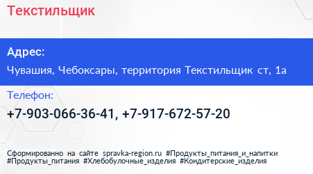 Текстильщик по адресу Чувашия, Чебоксары, территория Текстильщик ст, 1а в дальнейшем Организация, размещена в следующих категориях: