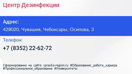 Центр Дезинфекции по адресу 428020, Чувашия, Чебоксары, Осипова, 3 в дальнейшем Организация, размещена в следующих категориях: