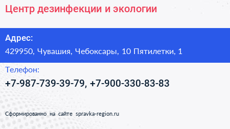 Центр дезинфекции и экологии по адресу 429950, Чувашия, Чебоксары, 10 Пятилетки, 1 в дальнейшем Организация, размещена в следующих категориях: