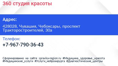 360, студия красоты по адресу 428028, Чувашия, Чебоксары, проспект Тракторостроителей, 30а в дальнейшем Организация, размещена в следующих категориях: