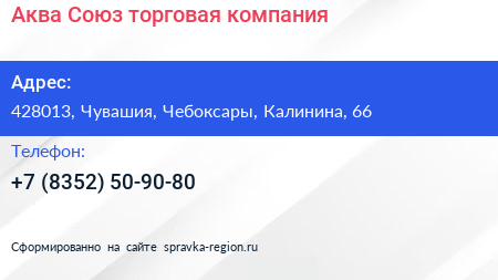 Аква-Союз, торговая компания по адресу 428013, Чувашия, Чебоксары, Калинина, 66 в дальнейшем Организация, размещена в следующих категориях:
