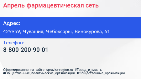 Апрель, фармацевтическая сеть по адресу 429959, Чувашия, Чебоксары, Винокурова, 61 в дальнейшем Организация, размещена в следующих категориях: