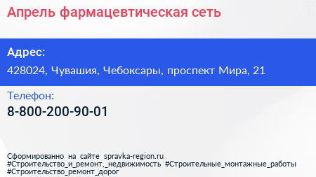 Апрель, фармацевтическая сеть по адресу 428024, Чувашия, Чебоксары, проспект Мира, 21 в дальнейшем Организация, размещена в следующих категориях: