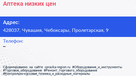 Аптека низких цен по адресу 428037, Чувашия, Чебоксары, Пролетарская, 9 в дальнейшем Организация, размещена в следующих категориях: