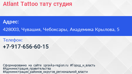 Atlant Tattoo, тату-студия по адресу 428003, Чувашия, Чебоксары, Академика Крылова, 5 в дальнейшем Организация, размещена в следующих категориях: