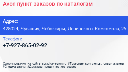 Avon, пункт заказов по каталогам по адресу 428024, Чувашия, Чебоксары, Ленинского Комсомола, 25 в дальнейшем Организация, размещена в следующих категориях: