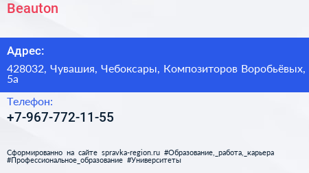Beauton по адресу 428032, Чувашия, Чебоксары, Композиторов Воробьёвых, 5а в дальнейшем Организация, размещена в следующих категориях: