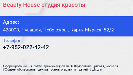 Beauty House, студия красоты по адресу 428003, Чувашия, Чебоксары, Карла Маркса, 52/2 в дальнейшем Организация, размещена в следующих категориях: