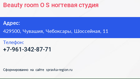 Beauty room O.S., ногтевая студия по адресу 429500, Чувашия, Чебоксары, Шоссейная, 11 в дальнейшем Организация, размещена в следующих категориях: