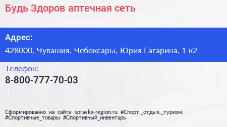 Будь Здоров, аптечная сеть по адресу 428000, Чувашия, Чебоксары, Юрия Гагарина, 1 к2 в дальнейшем Организация, размещена в следующих категориях: