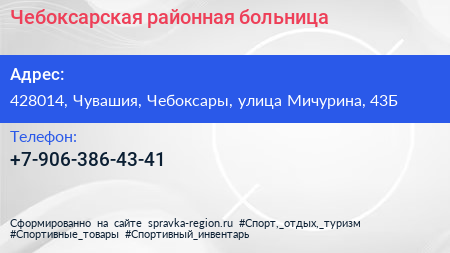 Чебоксарская районная больница по адресу 428014, Чувашия, Чебоксары, улица Мичурина, 43Б в дальнейшем Организация, размещена в следующих категориях: