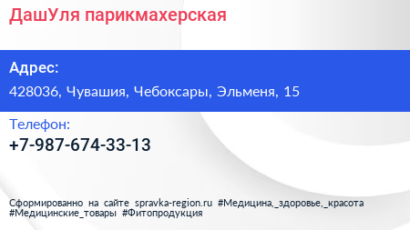 ДашУля, парикмахерская по адресу 428036, Чувашия, Чебоксары, Эльменя, 15 в дальнейшем Организация, размещена в следующих категориях: