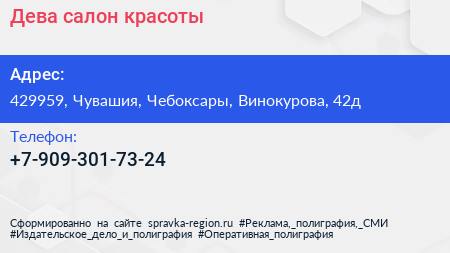 Дева, салон красоты по адресу 429959, Чувашия, Чебоксары, Винокурова, 42д в дальнейшем Организация, размещена в следующих категориях: