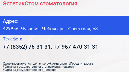 ЭстетикСтом, стоматология по адресу 429956, Чувашия, Чебоксары, Советская, 63 в дальнейшем Организация, размещена в следующих категориях: