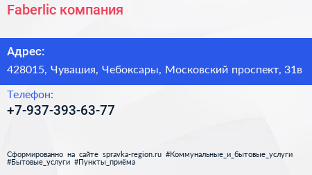 Faberlic, компания по адресу 428015, Чувашия, Чебоксары, Московский проспект, 31в в дальнейшем Организация, размещена в следующих категориях: