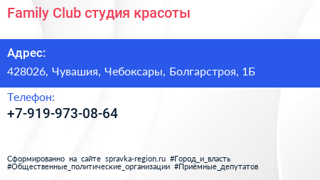 Family Club, студия красоты по адресу 428026, Чувашия, Чебоксары, Болгарстроя, 1Б в дальнейшем Организация, размещена в следующих категориях: