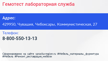 Гемотест, лабораторная служба по адресу 429950, Чувашия, Чебоксары, Коммунистическая, 27 в дальнейшем Организация, размещена в следующих категориях: