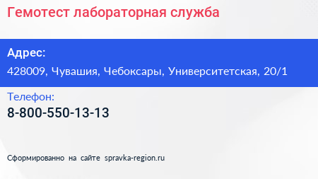 Гемотест, лабораторная служба по адресу 428009, Чувашия, Чебоксары, Университетская, 20/1 в дальнейшем Организация, размещена в следующих категориях: