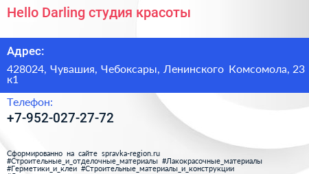 Hello Darling, студия красоты по адресу 428024, Чувашия, Чебоксары, Ленинского Комсомола, 23 к1 в дальнейшем Организация, размещена в следующих категориях: