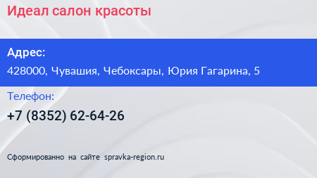 Идеал, салон красоты по адресу 428000, Чувашия, Чебоксары, Юрия Гагарина, 5 в дальнейшем Организация, размещена в следующих категориях: