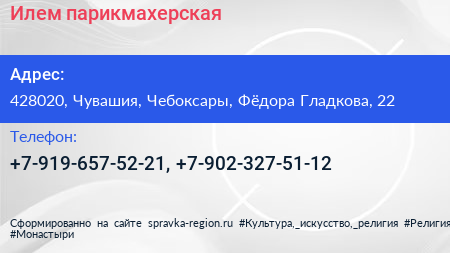 Илем, парикмахерская по адресу 428020, Чувашия, Чебоксары, Фёдора Гладкова, 22 в дальнейшем Организация, размещена в следующих категориях: