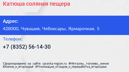 Катюша, соляная пещера по адресу 428000, Чувашия, Чебоксары, Ярмарочная, 5 в дальнейшем Организация, размещена в следующих категориях: