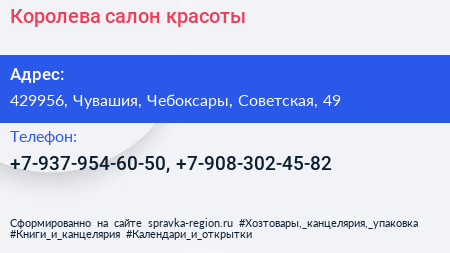 Королева, салон красоты по адресу 429956, Чувашия, Чебоксары, Советская, 49 в дальнейшем Организация, размещена в следующих категориях: