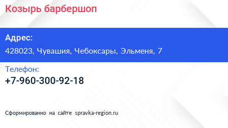 Козырь, барбершоп по адресу 428023, Чувашия, Чебоксары, Эльменя, 7 в дальнейшем Организация, размещена в следующих категориях: