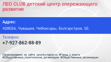 ЛЕО CLUB, детский центр опережающего развития по адресу 428026, Чувашия, Чебоксары, Болгарстроя, 1Б в дальнейшем Организация, размещена в следующих категориях: