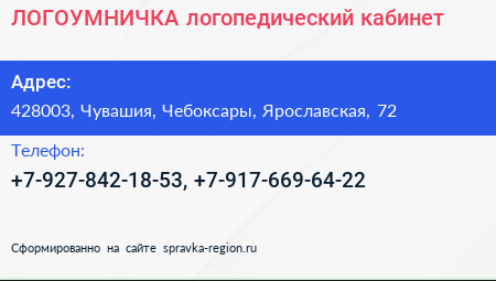 ЛОГОУМНИЧКА, логопедический кабинет по адресу 428003, Чувашия, Чебоксары, Ярославская, 72 в дальнейшем Организация, размещена в следующих категориях: