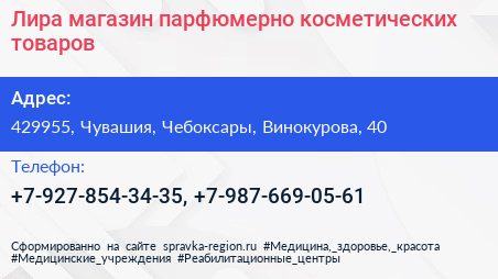 Лира, магазин парфюмерно-косметических товаров по адресу 429955, Чувашия, Чебоксары, Винокурова, 40 в дальнейшем Организация, размещена в следующих категориях: