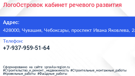 ЛогоОстровок, кабинет речевого развития по адресу 428000, Чувашия, Чебоксары, проспект Ивана Яковлева, 2а в дальнейшем Организация, размещена в следующих категориях: