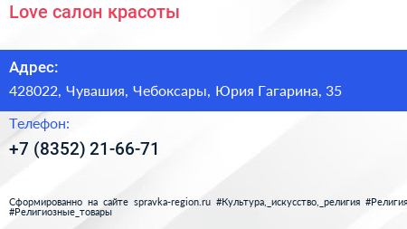 Love, салон красоты по адресу 428022, Чувашия, Чебоксары, Юрия Гагарина, 35 в дальнейшем Организация, размещена в следующих категориях: