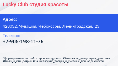 Lucky Club, студия красоты по адресу 428032, Чувашия, Чебоксары, Ленинградская, 23 в дальнейшем Организация, размещена в следующих категориях: