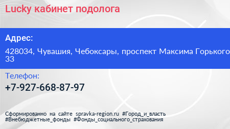 Lucky, кабинет подолога по адресу 428034, Чувашия, Чебоксары, проспект Максима Горького, 33 в дальнейшем Организация, размещена в следующих категориях:
