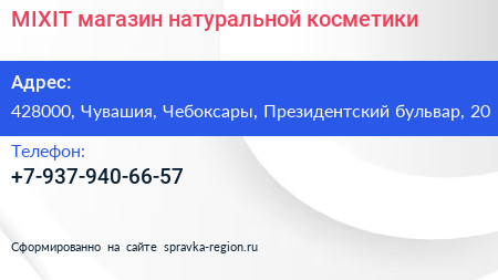 MIXIT, магазин натуральной косметики по адресу 428000, Чувашия, Чебоксары, Президентский бульвар, 20 в дальнейшем Организация, размещена в следующих категориях: