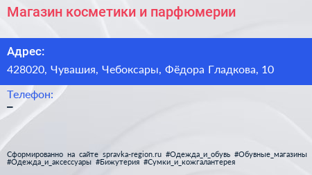 Магазин косметики и парфюмерии по адресу 428020, Чувашия, Чебоксары, Фёдора Гладкова, 10 в дальнейшем Организация, размещена в следующих категориях: