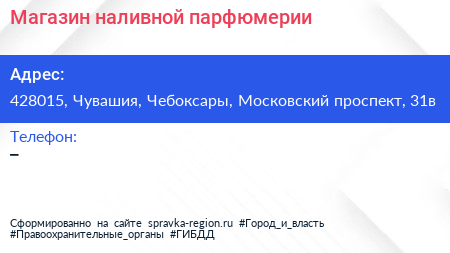 Магазин наливной парфюмерии по адресу 428015, Чувашия, Чебоксары, Московский проспект, 31в в дальнейшем Организация, размещена в следующих категориях: