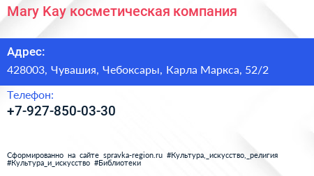 Mary Kay, косметическая компания по адресу 428003, Чувашия, Чебоксары, Карла Маркса, 52/2 в дальнейшем Организация, размещена в следующих категориях: