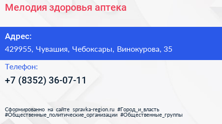 Мелодия здоровья, аптека по адресу 429955, Чувашия, Чебоксары, Винокурова, 35 в дальнейшем Организация, размещена в следующих категориях: