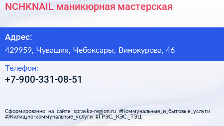 NCHKNAIL, маникюрная мастерская по адресу 429959, Чувашия, Чебоксары, Винокурова, 46 в дальнейшем Организация, размещена в следующих категориях: