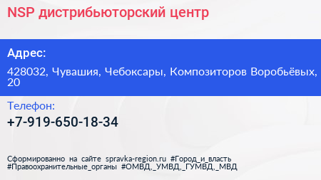 NSP, дистрибьюторский центр по адресу 428032, Чувашия, Чебоксары, Композиторов Воробьёвых, 20 в дальнейшем Организация, размещена в следующих категориях: